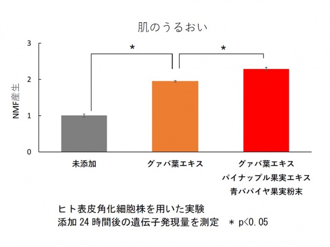 肌の乾燥は、多くの人が感じている悩みの一つです。肌が乾燥する原因には、空気の乾燥だけでなく、ストレスや生活習慣の乱れ、紫外線などによる、「肌のバリア機能」の低下があります。植物には高温多湿の過酷な環境を生き抜く生命力があることに着目して、今回肌のバリア機能を高める植物素材について探索したところ、お茶としても飲まれているグァバ葉から抽出したエキスに、肌が産生する天然保湿因子(NMF)の量を増やす効果と肌のバリア機能低下の一因である炎症を抑制する効果があることを発見しました。更に、グァバ葉エキスにパイナップル果実エキスと青パパイヤ果実粉末を組み合わせると、これらの効果が高まることも見出しました。この結果から、これらフルーツ由来の素材を組み合わせて摂取することで、肌のバリア機能を改善し、うるおいを高めることが期待されます。
