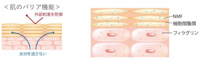 肌のバリア機能は、外部の刺激から肌を防御し、肌の内部の水分を逃さないようする働きで、肌のうるおいを保つために重要なポイントです。フィラグリンから作られる天然保湿因子(NMF)は、バリア機能を保つために必要な因子の一つです。