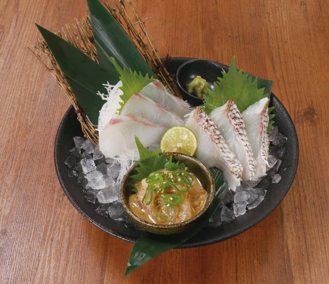 旬の桜鯛の御刺身の盛り合せです。桜鯛の素材の味をシンプルに引き出す“塩炙り”と、“胡麻だれ和え”も絶品です。