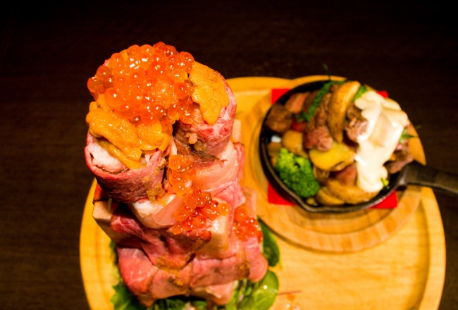 「3種の肉のチーズステーキマウンテン」は、ローズマリーの香りを移したオイルでサイコロ状にカットした牛・豚・鶏の3種類の肉を焼き上げ、数種類の野菜と共にスキレットに山盛りにします。お召し上がりの直前に、とろとろのチーズソースを上からかけて背徳感たっぷりの状態でお召し上がりいただくのがオススメです。「生ハム&ローストビーフの升タワー」は、生ハム・ローストビーフ・肉巻き寿司を全長約29cm(升を含む)の高さに積み上げた肉タワー!1~2段目は、逆さにした升を覆うように生ハムとローストビーフを順に盛りつけ、3段目の升の中には、酢飯と錦糸卵を敷き詰めます。その上には生ハム巻き寿司とローストビーフ巻き寿司を積み、頂上にはウニといくらの黄金ペアをこぼれるくらいに盛りつけて完成!