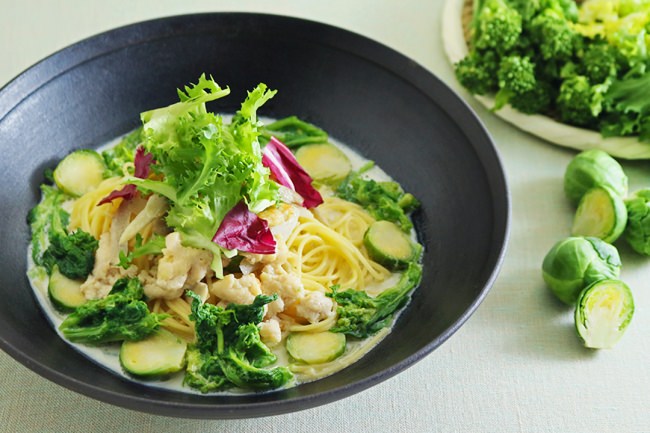 芽キャベツや菜の花といった春野菜をふんだんに使用しました。春野菜は春においしいだけではなく、栄養素がたくさん含まれているのが特徴です。