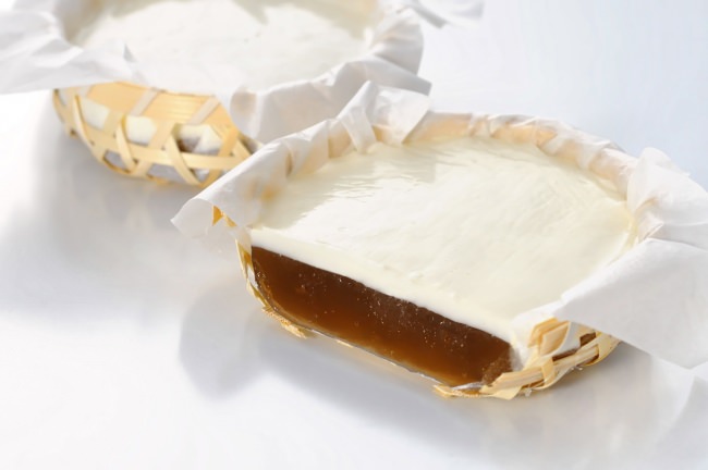 一つずつ籠にお入れした、わらびもちとあっさりしたレアチーズの2層仕立ての新感覚のお菓子。プルンとしたわらびもちとツルンとしたレアチーズの食感の組み合わせにこだわりました。