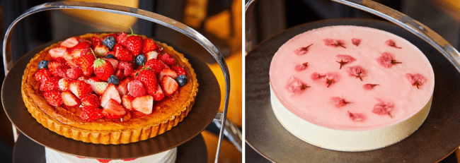 スプリングデザートワゴンでは、旬の国産いちごを贅沢に使用した「ストロベリーショートケーキ」や、「いちごのタルト」、桜がほのかに香る「桜ムーズ」や、「桜シフォンケーキ」など、春を感じる見た目にも華やかな全7種類のスイーツをワゴンで提供いたします。