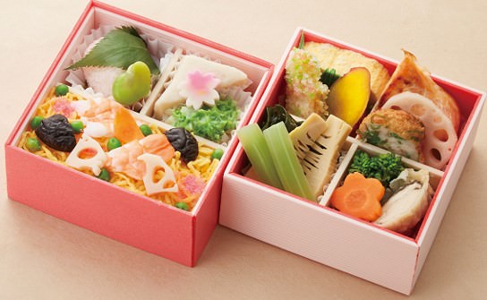 若竹煮、木の芽など季節の料理と華やかなちらし寿司を盛りつけた二段重。