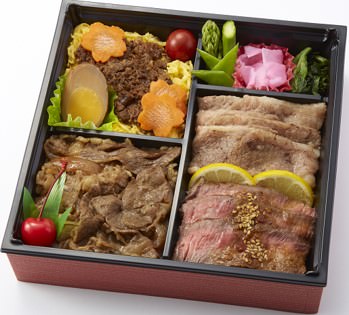 ステーキ、すき焼き、焼肉、そぼろの4種類を使った華やかな肉弁当です。