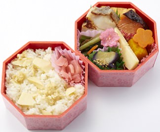 たけのこご飯、野菜の煮物、焼き魚などが楽しめる2段弁当。