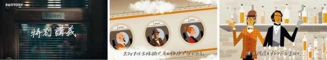 「ティーチャーズ先生」による「ティーチャーズ」の特別講義がポップなアニメーションで開講されます。「ティーチャーズ」が1863 年に発売されるまでのこだわりや経緯が解説され、今にもスモーキーな香りを味わえそうな講義は、「ティーチャーズ」の魅力がさらに伝わる内容となっており、視聴者の興味を掻き立てます。アニメーションの世界観に溶け込む大泉洋さんの自然体な演技にも注目です。