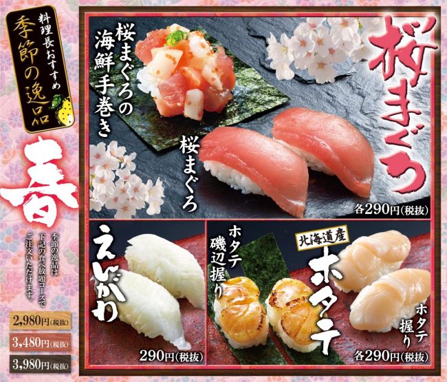 昨年の春にも登場した「桜まぐろ」が今年も登場。わずか10%しか取れない鮮やかな赤身だけを選別したびんちょうまぐろを丁寧に活〆することで、鮮度良く、もっちりとした食感を実現しています。素材の味をそのまま味わう「桜まぐろ握り」、とろサーモン、イカ、とびっこを加えた「桜まぐろの海鮮⼿巻き」 の2種類をお楽しみいただけます。 他にも、旨味と甘味が特徴の「北海道産ホタテ」は「ホタテ握り」、焦がし醤油の香ばしさ、海苔の風味、ホタテの甘味が楽しめる「ホタテ磯辺握り」、⼈気の「えんがわ握り」もご⽤意しました。