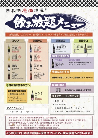 日本酒原価酒蔵全店(http://sake-genkabar.com)にて時間無制限飲み放題を3/18(水)まで期間限定で実施致します。獺祭など特定名称酒をメインとした日本酒20種以上、生ビールやハイボールも含む飲み放題メニューが時間無制限でなんと