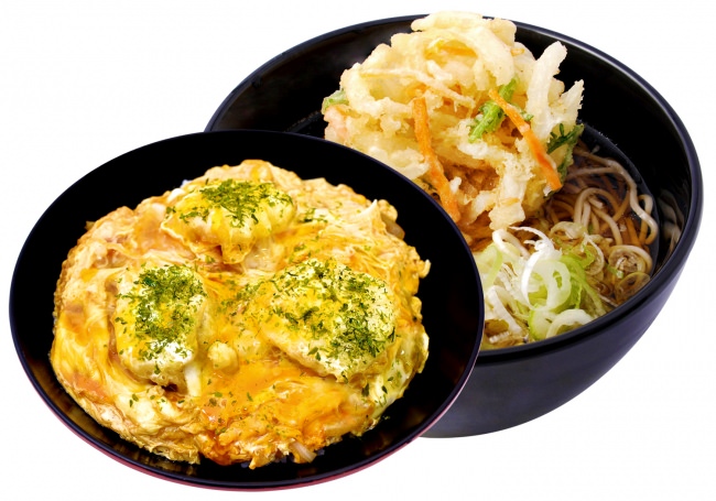 むつ湾産のほたて天3個を卵でとじて青のりを振りかけたどんぶりに、ミニかき揚げ天そばをセットにしました。ボリューム感のある一品です。