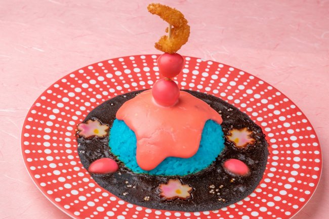 2020年の春が訪れた日本。地球に見立てたブルーライスに桜カラーのフォンデュチーズをたっぷりかけた春を祝うブラックカレーライス。カレーは焦がしカラメルを入れて作った本格派のスパイシーカレーです。