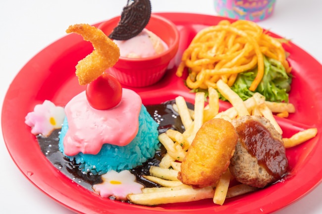 甘口のブラックカレーにチキンナゲット、ミニハンバーグ、ポテト、ナポリタン、デザートが付いたサクラサクライスのお子様ランチプレート。