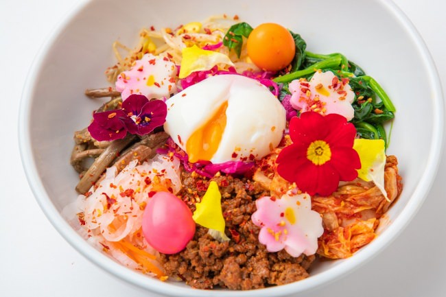 韓国ソウルフードのビビンバに春の香りを感じる桜麩とエディブルフラワーをあしらった、見た目も春らしい一品。モンスター特製ふりかけで激辛に味変を楽しめるオリジナルビビンバブー!