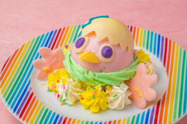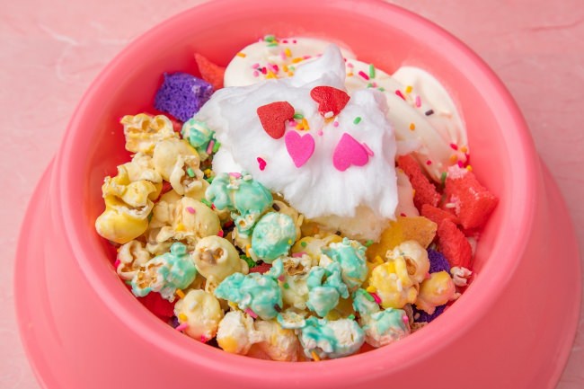ホワイトチョコでコーティングしカラフルシュガーをふりかけた特製ポップコーンを当店人気のピンクキャットフード(アイスクリーム)にたっぷりトッピング。イースターカラーの限定ピンクキャットフードです!