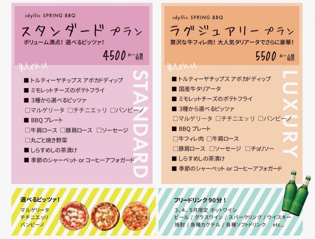 春のBBQプランとして、「スタンダードプラン」と「ラグジュアリープラン」の2種をご用意。お肉はタイムやローズマリーが入った自家製ハーブオイル&ソルトで召し上がり頂くので、ボリュームある内容でも食べ飽きず最後まで楽しんで頂けます。薪窯で焼くナポリピッツァは3種から選べ、〆は旬の食材”しらす”の出汁茶漬けであっさりと。