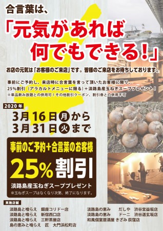 「飲食代25%割引き+淡路島玉葱スーププレゼント」を3月16(月)~3月31日(火)の期間実施致します。