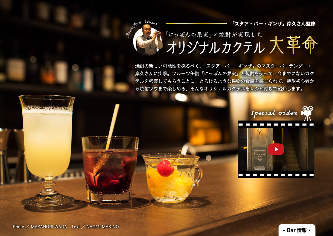 「黄綬褒章」を受章するなど、世界的にも注目を浴びる「スタア・バー・ギンザ」のマスターバーテンダー・岸久さんが、フルーツ缶詰「K&K にっぽんの果実」と焼酎を使って今までにないカクテルを考案。焼酎初心者から焼酎ツウまで幅広く楽しめるオリジナルカクテルを、レシピ付きで紹介します。バーの雰囲気やカクテルを作る様子は動画でも公開。