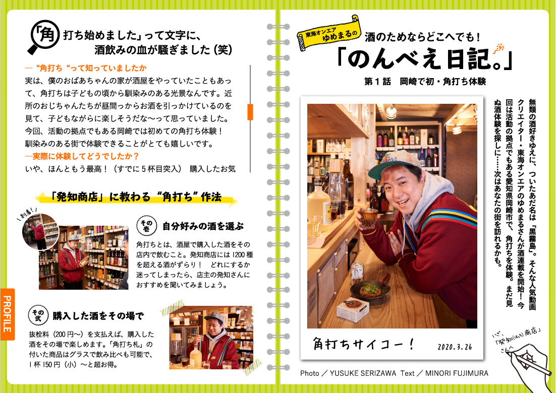 2019年上半期YouTubeチャンネル総再生数1位、チャンネル登録者数500万人を誇る、6人組の大人気動画クリエイターグループ・東海オンエアのメンバーで、無類の酒好きとして知られるゆめまるさんが酒連載を開始!第1回は、活動の拠点でもある愛知県岡崎市で初・角打ち体験。今回の酒体験の感想から最近の飲み旅ハナシまで、たっぷりと“酒旅談義”を聞かせてもらいました。