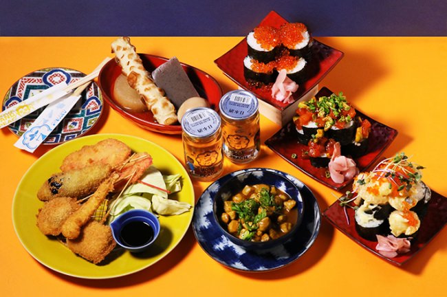 寿司、煮込料理、串カツ、おでんを提供する “こちらトーキョー~TOKYO CALLING~”。ボルケーノ寿司は、巻き寿司の上からこぼれるほどの具材をトッピング。
