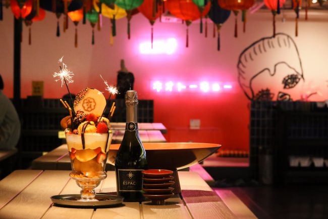 「メガパフェ」も同時リニューアル。シューアイスにドーナッツ、イチゴ、カスタードやホイップクリームをたっぷりトッピングしたパフェは、全長約42センチ!ご予約限定で、乾杯のスパークリングワインが付いたパックもご用意しております。みんなでワイワイ盛り上がれること間違いなし。大切な人の御祝いは『サナギ 新宿』で!