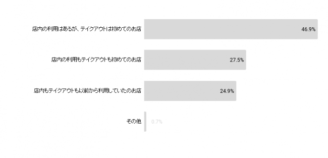 テイクアウト利用した飲食店は、店内利用経験はあるがテイクアウト利用は初めてという回答が約47%、全くの初めてと言う回答も約28%。