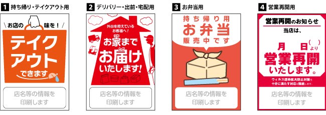 株式会社ウイル・コーポレーションが運営するネット印刷のプリントモールは、飲食店の皆様で使っていただけるようにと、「テイクアウト」「デリバリー」「お弁当」「営業再開」の4種のポスターを用意しました。「お店の名前、営業時間、電話番号、営業日(定休日)、ご希望の図柄1種、部数(最大5枚まで)」をご指定いただければ、お店用のポスターを、印刷してお届けいたします(発送先は日本国内に限らせていただきます)。新型コロナウイルス対策に取り組んでいらっしゃる皆様方を応援するために、印刷代、送料を含め無料とさせていただきます。お申込み期限は令和2年5月31日です。