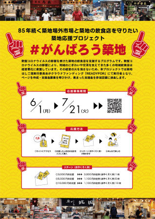 2020年6月1日(月)から7月21日(火)23時まで、「85年続く築地の場外市場と築地の飲食店を守りたい 築地応援プロジェクト」として、300万円を目標に支援金を募集いたします。また支援いただいた方々に、コロナウイルス収束後、すしざんまいや寿司清など約50店舗の築地の飲食店でお得にお食事が可能な【やくそくお食事券】と、全国の支援者の皆様へ築地の名店の食材を届ける【築地の名店お取り寄せ】をリターンとしてご用意いたしました。活気ある築地を取り戻すため、築地場外市場の食文化そして美味しい飲食店を守るため、皆様のご支援をお待ちしております! #がんばろう築地