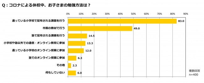 コロナ休校中、子どもがどのように勉強していたかを尋ねたところ、「通っている小学校で配布される課題を行う」と回答した人が83.0%と最も多かった。「市販の教材で行う」と回答した人は49.0%にのぼり、課題以外の勉強も自主的に行っていたことが分かった。