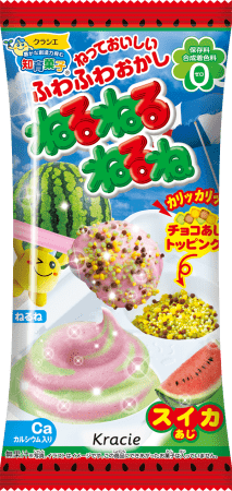 ねっておいしいふわふわおかし「ねるねるねるね」に期間限定のスイカ味が登場。粉と水を混ぜると色が緑色から赤色に変わります。