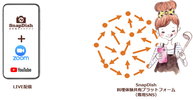 オンライン会議システムであるZoom、普及率の高い動画サービスYouTube、料理特化型SNSであるスナップディッシュの利点を組み合わせることで、一方的な映像配信ではなく、双方向性を持った深い料理体験づくりをスケーラブルに提供できます。