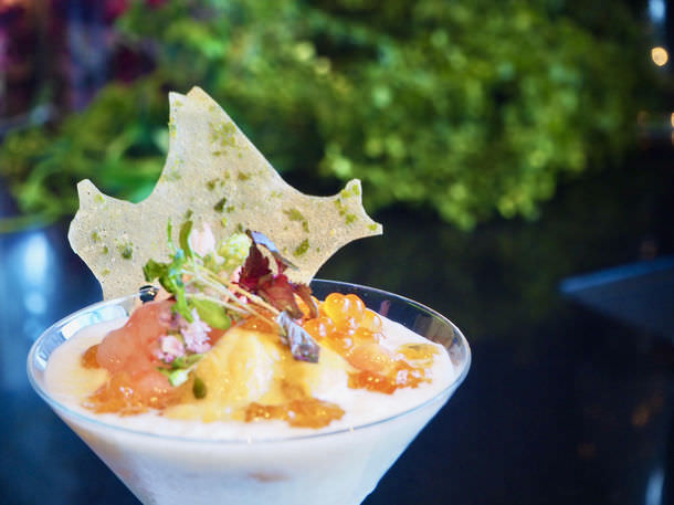 「北海道海の幸のパフェ」…味わいは海鮮丼をイメージ!北海道の海の幸、ズワイガニ、雲丹、イクラ、サーモン、甘海老、和出汁のジュレ、お米と新玉ネギのムースのパフェ仕立て。
