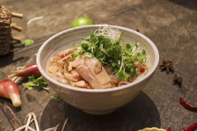 海老の旨みが詰まったタイの「トムヤムクン」。たっぷりの香草と辛さと酸味の効いたスープのつけ麺スタイルで。