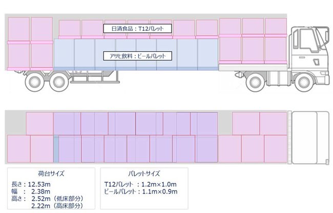 9月11日からスタートする今回の共同物流では、製品の高さやパレットサイズの異なる両社製品を日本通運の車両に混載し、海上輸送します。アサヒビール茨城工場で製品を積載した車両は、日清食品の関東工場に立ち寄り混載作業を行い、その後、九州の物流倉庫に向けて2社の貨物をまとめて共同輸送します。
