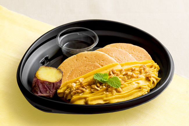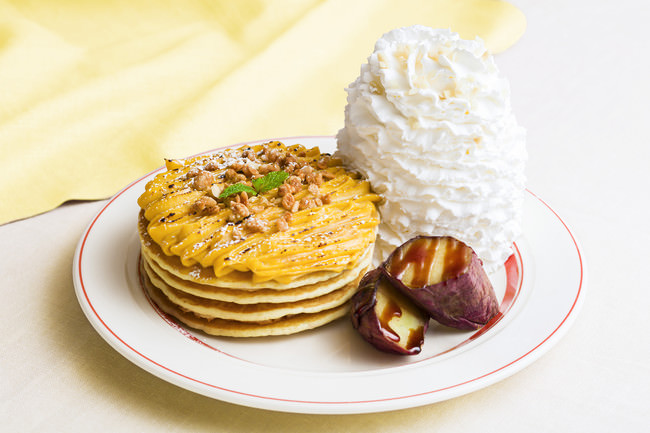 “安納芋”たっぷりのスイートポテトクリームをのせたパンケーキ。添えられた“紅はるか”で二つのお芋の味わいをお楽しみいただけます。カラメルソースとご一緒にどうぞ!