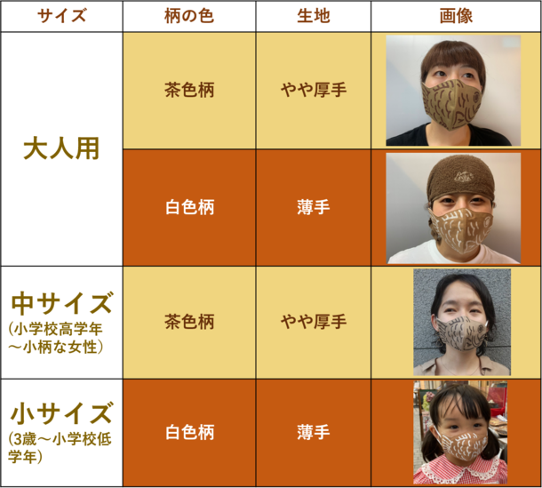 大人用のマスクは2色の展開でしたが、子供・女性用サイズは小サイズが薄手の白色柄、中サイズがやや厚手の茶色柄と、サイズごとに柄の色と生地を分けています。