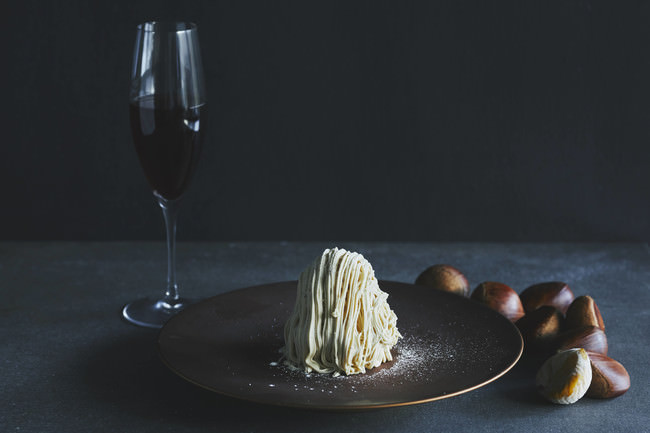 ナッツ感のあるコロンビア産ミルクチョコレートのフローズンに和栗を濾して作ったモンブランクリームをのせ、最後に和栗をトッピング。底のカシスソースの酸味がアクセントになっています。