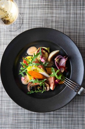 箱根近隣の地域由来の旬食材を多く取り入れてご用意したサラダ。カボチャやさつま芋、キノコなどをローストし、果実やルッコラなどのハーブを組み合わせた全体が調和されたサラダです。