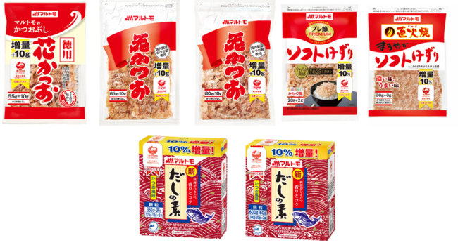 マルトモ株式会社(社長:今井均 本社:愛媛県伊予市) は、主要商品の「徳用花かつお 55g」、「新さつま65g」、「新さつま80g」3 品を10g増量いたします。また「プレ節®25 ミクロンソフトけずり20g 」、「新直火焼ソフト削り30g」、「新鰹だしの素350g」、「新鰹だしの素600g」4 品を10%増量いたします。※2020年10月中旬から順次切り替えの数量限定販売になります。