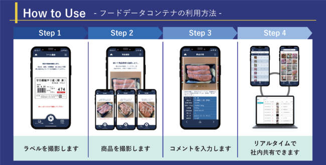 また、社内で一括管理・共有に取り組もうにも、現場の社員は日々業務に忙殺され、取り組みそのものが根付きにくいという声も多いのが現状です。「フードデータ・コンテナ」は、このような状況に対するソリューションとして誕生しました。本サービスは、食品メーカー・卸・スーパーマーケットのバイヤーやマーケティング担当者の為に設計された専用アプリとWEBサービスで構成され、MR活動の情報収集の迅速化、社内の情報共有を推進し、時間及びコストの削減に寄与します。