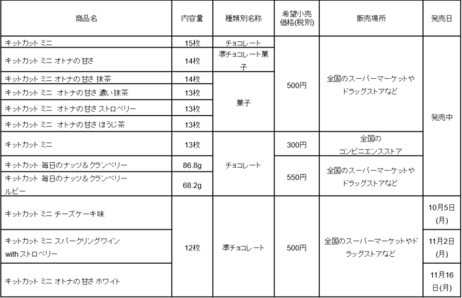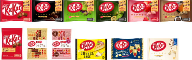 ※「キットカット ミニ チーズケーキ味 12枚」「キットカット ミニ スパークリングワイン with ストロベリー 12枚」「キットカット ミニ オトナの甘さ ホワイト 12枚」は期間限定製品です。