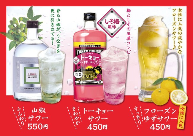 山椒のピリッとした風味が癖になる「山椒サワー」、梅しその豊かな香りでついついお酒が進んでしまう「トーキョーサワー(梅しそサワー)」、たっぷりのゆずシャーベットがのった「フローズンゆずサワー」など、気になるラインアップが目白押し。ぜひお試しくださいませ。