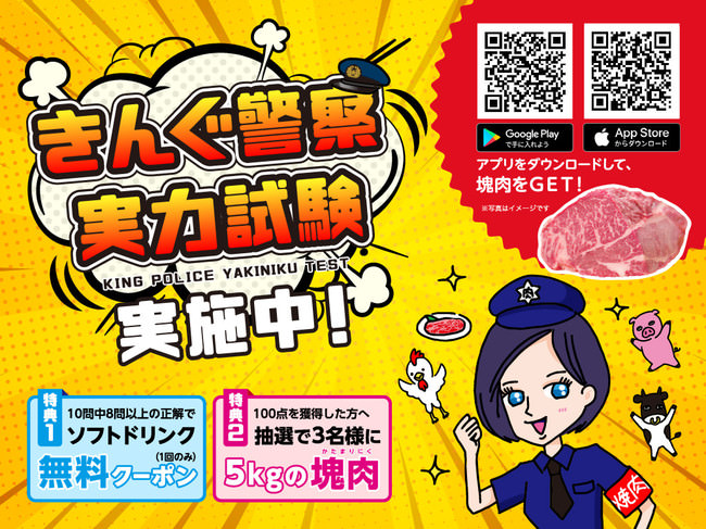 今回は、より美味しく焼肉を食べていただくために、「きんぐ警察実力試験」と題して少し難しめのクイズを出していきます。クイズに参加して焼肉への理解をさらに深めていただきたいと思います。あなたも焼肉の大天才になって、「国産牛5kgの塊肉」をゲットしよう!