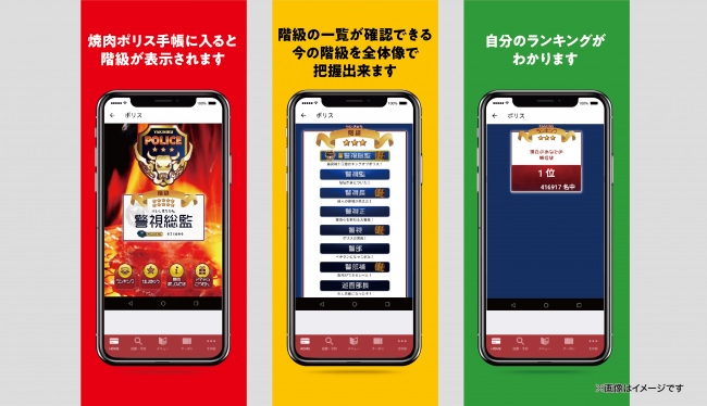 お客様にもっと『焼肉きんぐ』をお楽しみいただくためのプログラムです。 来店回数に応じて上がる階級(会員ランク)は、巡査から警視総監までの10階級。 特定の階級へ到達すると『焼肉きんぐ』オリジナルグッズをもれなくプレゼントいたします。