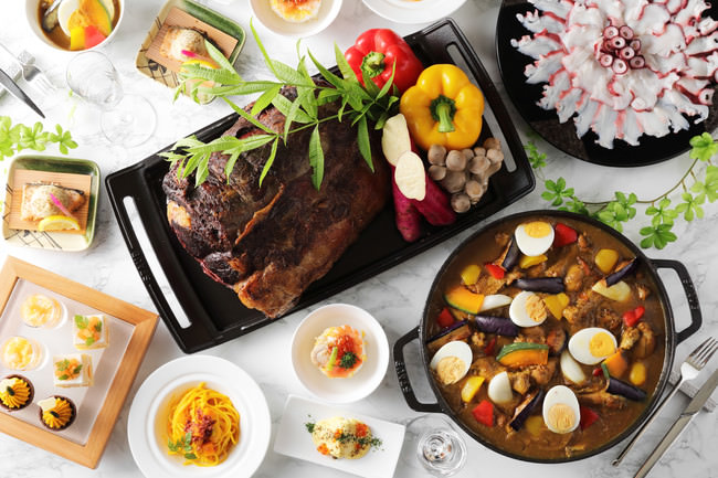 ランチではジャック・オ・ランタンをイメージしたカボチャのクリームパスタ、カボチャとモッツアレラチーズ、またスパイシーなスープカレー、見た目もワイルドな水蛸のしゃぶしゃぶなどをご用意。ディナーではハンバーグとカボチャのチーズフォンデュ、目玉のようにも見えるいくらタワー(土・日・祝日ディナー)などシェフのアイデアいっぱいの料理が揃います。