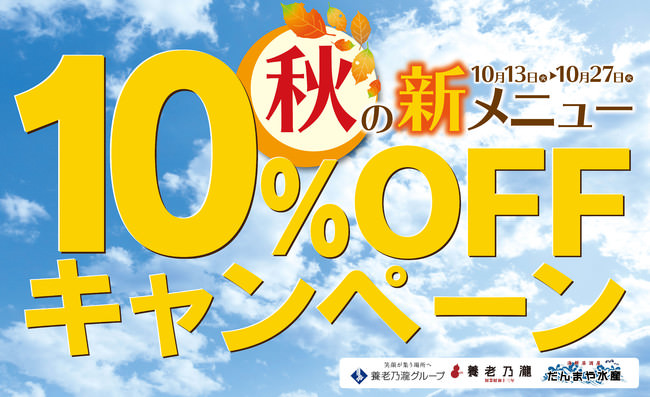 養老乃瀧株式会社(本社:東京都豊島区、代表取締役:矢満田 敏之)は、グループチェーン「養老乃瀧」、「だんまや水産」に於いて、2020年10月13日(火)~10月27日(火)の15日間、『秋の新メニュー10%OFFキャンペーン』を開催いたします。