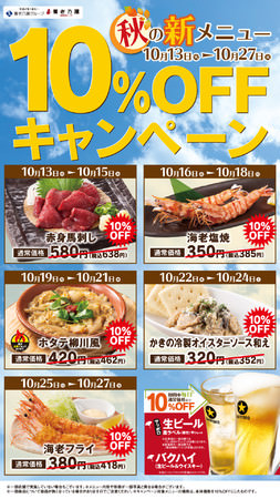 10月13日(火)の新メニューの導入にあわせ、数多の新メニューの中から厳選した対象のメニューを3日ごとに入れ替え、10%OFFで販売をいたします。また、期間中「サッポロ生ビール<樽生>(中ジョッキ)」と「バクハイ(生ビール&ウイスキー)」を毎日10%OFFにて販売します。是非、春の新メニューをご賞味いただき、おいしいお酒とお料理をお楽しみください。