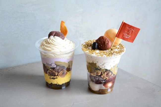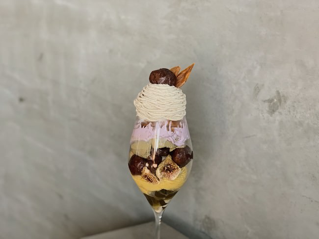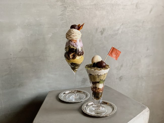 栗や紫芋、南瓜あん、焙じ茶や無花果、白ごま等、日本の秋を感じるパフェ