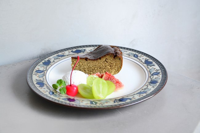 愛媛県脇製菓の香り高いほうじ茶を使用した自家製バスクチーズケーキに、季節の果実を添えています
