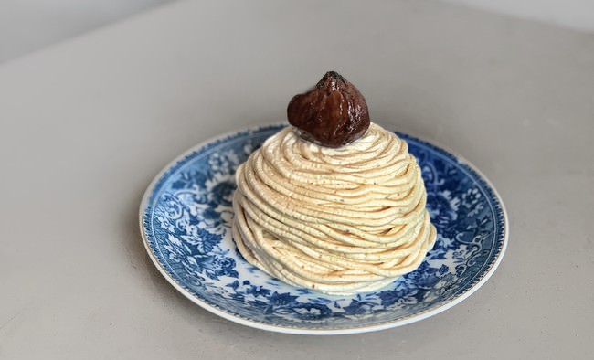 モンブランに見立てた自家製のほうじ茶ババロアに愛媛県産の和栗のクリームと渋皮煮をコーティング