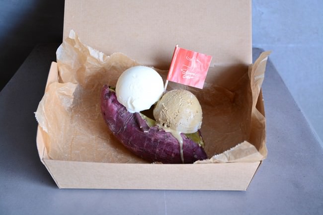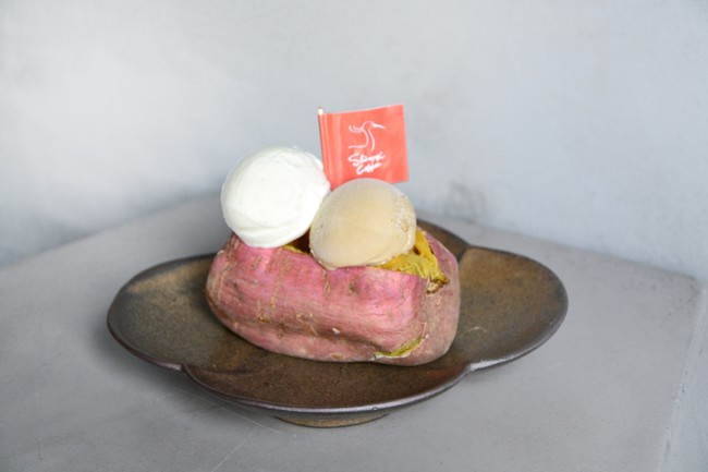安納芋のとろとろした焼き芋に、ほうじ茶アイスと濃厚ミルクアイスを載せたスイーツ